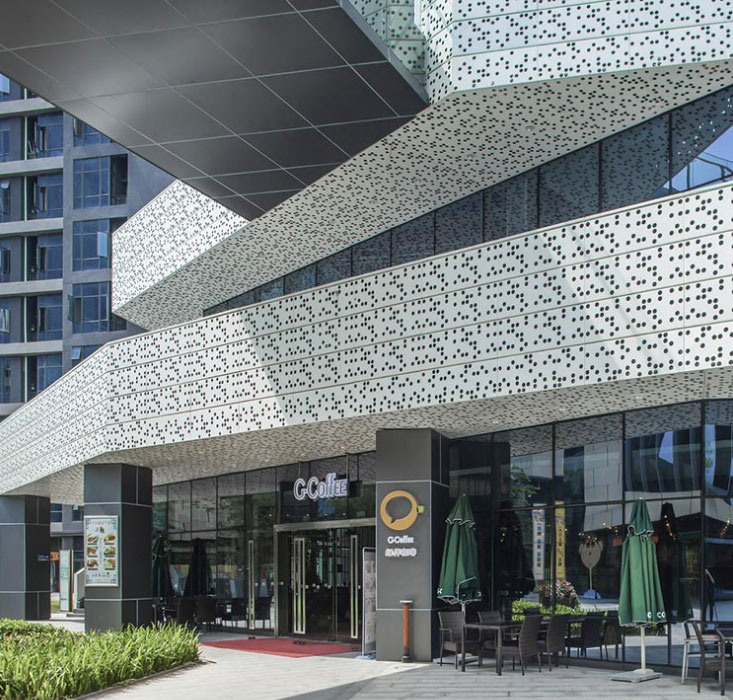 幕墻裝飾配以不同顏色和形狀各異的沖孔鋁單板,增加了時尚與個性元素,營造出獨特的立體效果,富有藝術(shù)特色,更會提升建筑的層次感和現(xiàn)代感,沖孔鋁單板顏色按客戶要求進行調(diào)配,也可由公司負責(zé)提供標準色卡供客戶選擇。